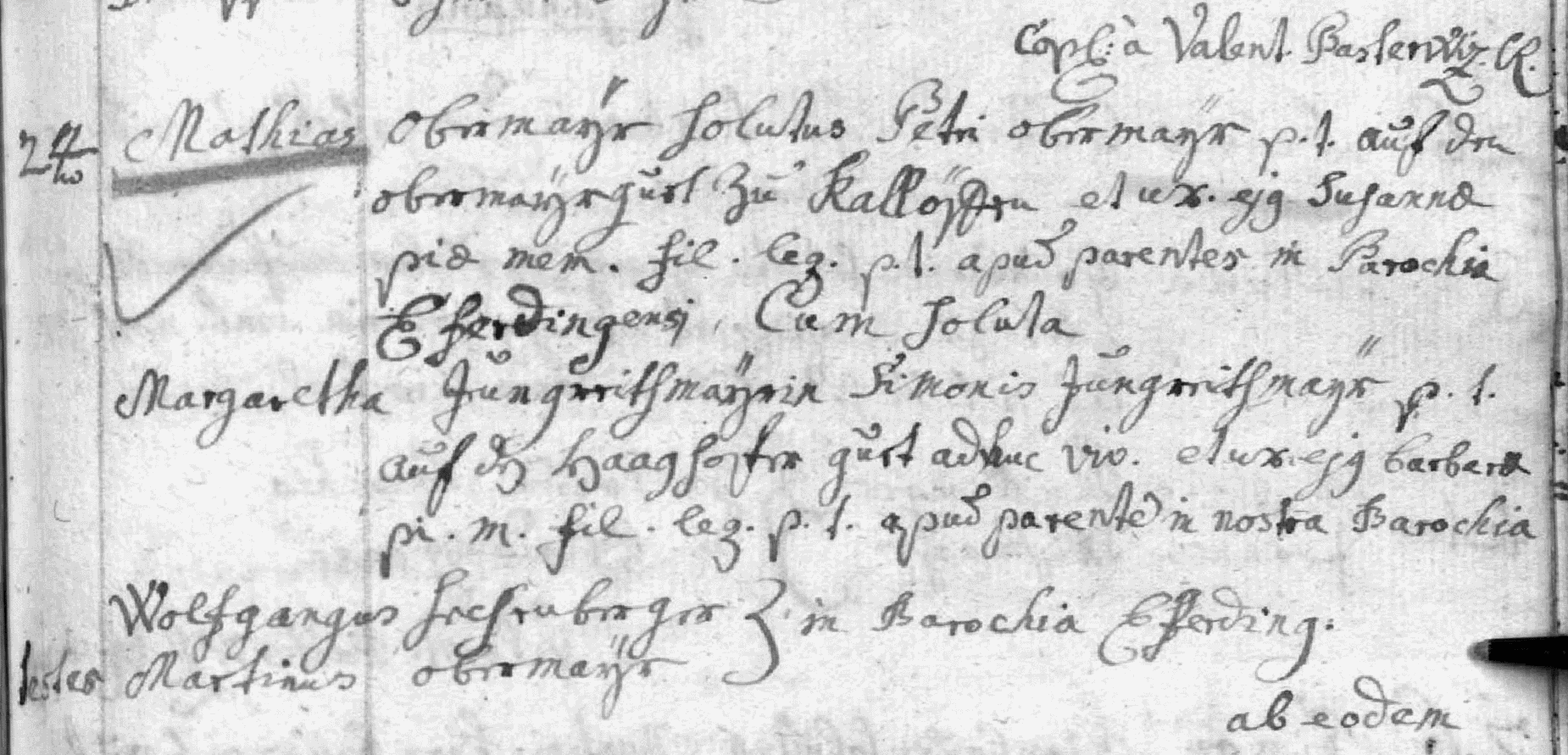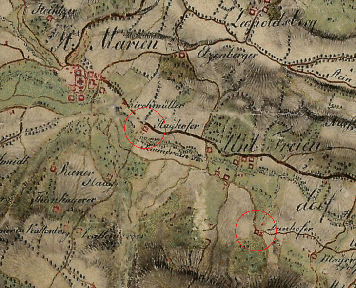 Der Sohn von Josef und Theresia (Engertswieser), Georg Obermayr (28. 3. 1784 - 11. 3. 1847), zog nach Stroheim und ehelichte dort am 24. 7. 1815 die Witwe Maria Schweizer (geb. Scharinger), die alleinige Besitzerin des Hinternedergutes zu Knieparz ob der Leiten 15, Pfarre Hartkirchen.