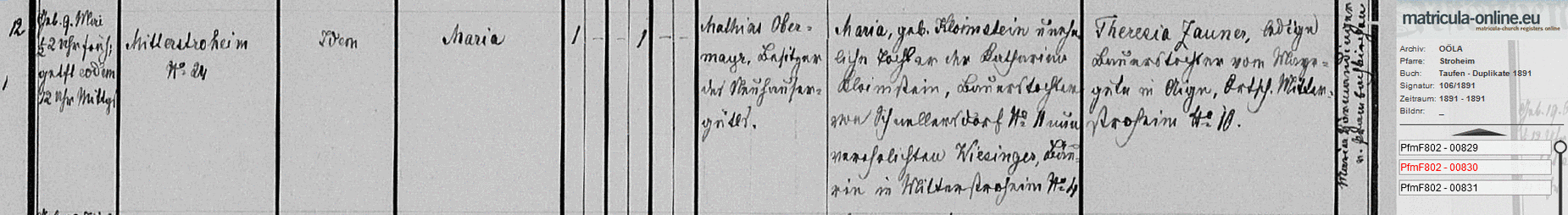 Mitterstroheim Nr. 24Neuhausergut - Mitterstroheim 24 Ausschnitt aus der Urmappe von 18259. Mai 1891Am 10. Februar 1891 hat Mathias Obermayr die Maria Kloimstein aus Schnellerdorf 11 geheiratet. Wie ein Wunder kam aber bereits 3 Monate später am 10. Mai 1891 meine Großmutter zur Welt ...Taufbuch Stroheim - Maria Obermayr
